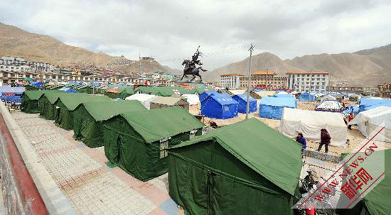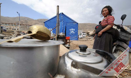 4月18日,在玉树县结古镇,藏族妇女白嘎在帐篷前做家务。