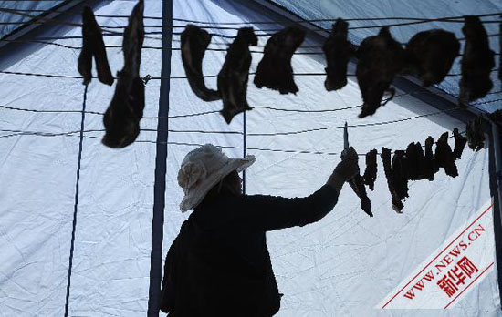 4月18日,在玉树县结古镇,一位当地居民在帐篷里挂晾牛肉。