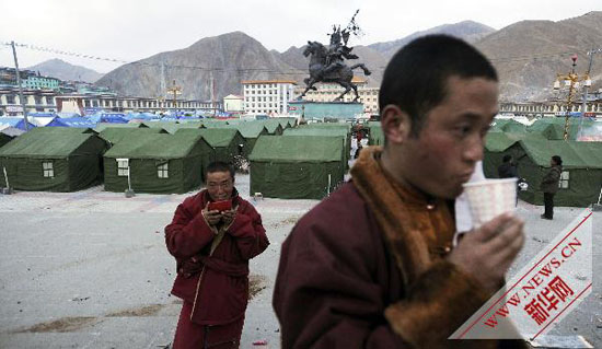 两位僧侣在玉树县结古镇的临时安置点喝粥(4月17日摄)。在临时安置点安顿下来的受灾群众,已经开始在废墟旁生火做饭,晾晒牛肉,灾后生活正在逐步展开。 新华社记者江宏景摄