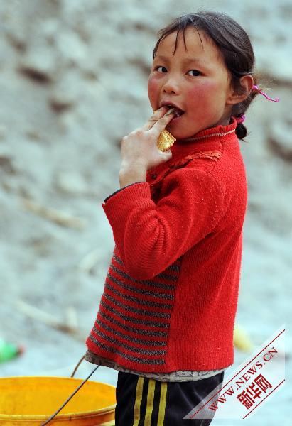 4月18日,6岁的藏族小姑娘庆吉拉毛走出家门去接水。当日,青海省玉树地震发生后第五天,在临时居住点安顿下来的受灾群众,积极展开互助自救,清理废墟,临时居住点的灾后生活正在逐步展开。新华社记者侯德强摄