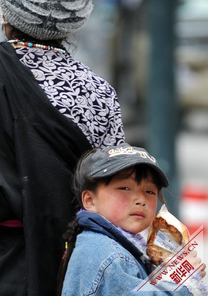 4月18日,拿着面包的藏族小姑娘拉毛走在结古镇的大街上。当日,青海省玉树地震发生后第五天,在临时居住点安顿下来的受灾群众,积极展开互助自救,清理废墟,灾后生活正在逐步展开。新华社记者侯德强摄