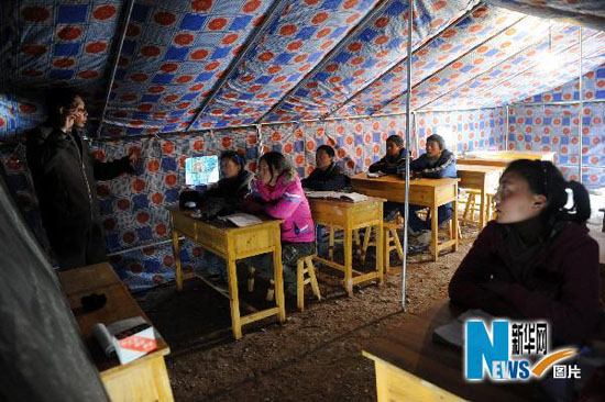 当日,刚刚完成帐篷搭建的青海省玉树藏族自治州第一民族中学3个年级的学生开始复课。学校有关负责人介绍,随着更多的桌椅等捐赠物资陆续抵达,各年级都将尽快恢复正常教学秩序。新华社记者朱祥摄