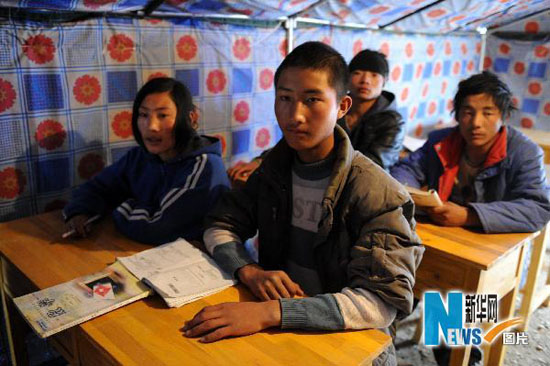 4月18日,玉树藏族自治州第一民族中学八年级学生在帐篷教室内上课。新华社记者朱祥摄