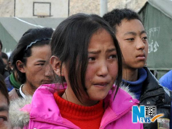 4月18日,玉树藏族自治州第一民族中学一名学生在复课仪式上流下泪水。新华社记者朱祥摄