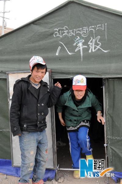 4月18日,玉树藏族自治州第一民族中学八年级的两位学生走出帐篷教室。新华社记者朱祥摄