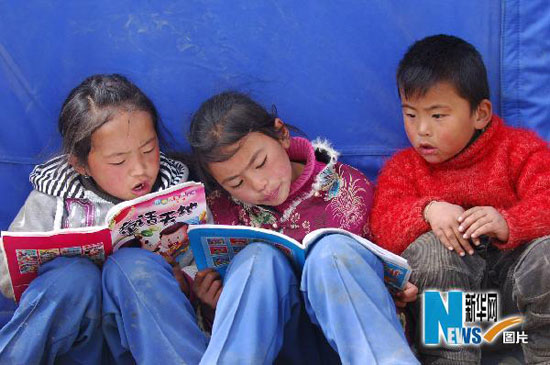 4月17日,在玉树结古镇一处受灾群众临时安置点,才仁坎卓(左)和伙伴一起在救灾帐篷前看书。 6岁的程烈卓玛,9岁的才仁坎卓,10岁的明玛扎西,他们自小就居住在青海省玉树藏族自治州结古镇。2010年4月14日发生的地震,让他们居住的房屋都受到不同程度的破坏。如今,这些孩子和他们的父母居住在结古镇一处受灾群众临时安置点,一顶顶蓝色帐篷是他们临时的家,在这片小天地里,原本不相识的他们成为亲密的伙伴。新华社记者 张宏祥摄