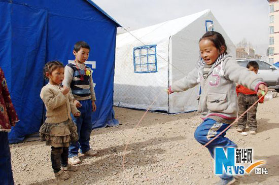 4月17日,在玉树结古镇一处受灾群众临时安置点,才仁坎卓在跳绳。 6岁的程烈卓玛,9岁的才仁坎卓,10岁的明玛扎西,他们自小就居住在青海省玉树藏族自治州结古镇。2010年4月14日发生的地震,让他们居住的房屋都受到不同程度的破坏。如今,这些孩子和他们的父母居住在结古镇一处受灾群众临时安置点,一顶顶蓝色帐篷是他们临时的家,在这片小天地里,原本不相识的他们成为亲密的伙伴。新华社记者 张宏祥摄