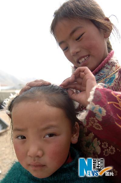4月17日,在玉树结古镇一处受灾群众临时安置点,尕松措毛(右)在为程烈卓玛别发卡。 6岁的程烈卓玛,9岁的才仁坎卓,10岁的明玛扎西,他们自小就居住在青海省玉树藏族自治州结古镇。2010年4月14日发生的地震,让他们居住的房屋都受到不同程度的破坏。如今,这些孩子和他们的父母居住在结古镇一处受灾群众临时安置点,一顶顶蓝色帐篷是他们临时的家,在这片小天地里,原本不相识的他们成为亲密的伙伴。新华社记者 张宏祥摄