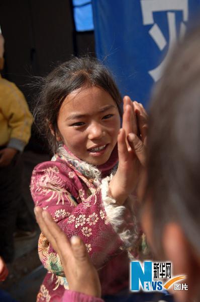 4月17日,在玉树结古镇一处受灾群众临时安置点,尕松措毛在和伙伴一起做游戏。 6岁的程烈卓玛,9岁的才仁坎卓,10岁的明玛扎西,他们自小就居住在青海省玉树藏族自治州结古镇。2010年4月14日发生的地震,让他们居住的房屋都受到不同程度的破坏。如今,这些孩子和他们的父母居住在结古镇一处受灾群众临时安置点,一顶顶蓝色帐篷是他们临时的家,在这片小天地里,原本不相识的他们成为亲密的伙伴。新华社记者 张宏祥摄
