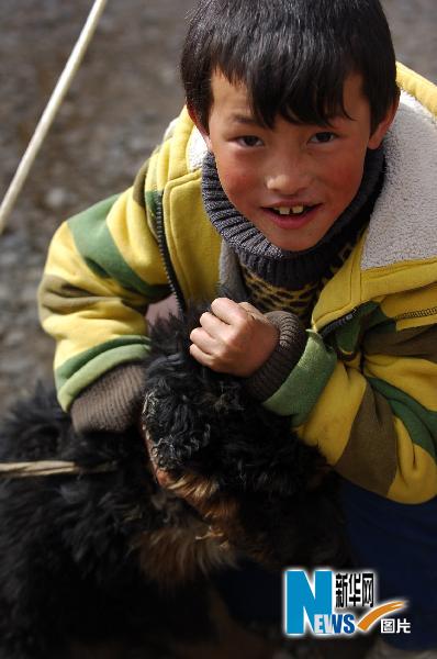 4月17日,在玉树结古镇一处受灾群众临时安置点,明玛扎西和他的小狗一起玩耍。 6岁的程烈卓玛,9岁的才仁坎卓,10岁的明玛扎西,他们自小就居住在青海省玉树藏族自治州结古镇。2010年4月14日发生的地震,让他们居住的房屋都受到不同程度的破坏。如今,这些孩子和他们的父母居住在结古镇一处受灾群众临时安置点,一顶顶蓝色帐篷是他们临时的家,在这片小天地里,原本不相识的他们成为亲密的伙伴。新华社记者 张宏祥摄
