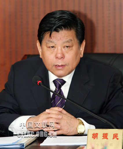 4月19日,中国文联党组召开会议,就援助青海玉树地震灾区进一步部署抗震救灾工作。图为中国文联党组书记、副主席胡振民主持会议。中国文联网 余宁 摄