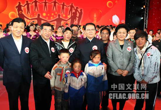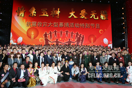 4月20日晚,由中宣部、民政部、国家广电总局、中国红十字会总会、中华慈善总会联合主办的“情系玉树 大爱无疆”抗震救灾大型募捐活动在北京隆重举行。募捐活动结束时,现场共募集到各类款项21.75亿元人民币。图为中共中央政治局常委李长春,中共中央政治局委员、国务院副总理、国务院抗震救灾总指挥部总指挥回良玉,中共中央政治局委员、中央书记处书记、中宣部部长刘云山,中共中央政治局委员、国务委员刘延东,全国人大常委会副委员长、中国红十字会会长华建敏,全国政协副主席、中国社会科学院院长陈奎元等领导与参演人员和爱心人士在一起。中国文联网 余宁 摄