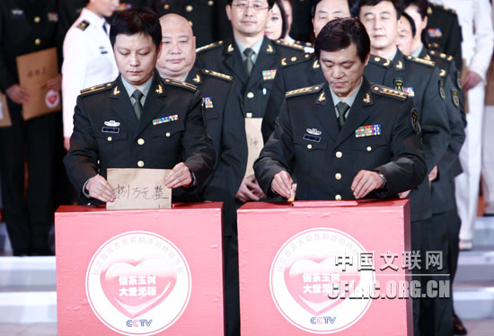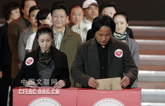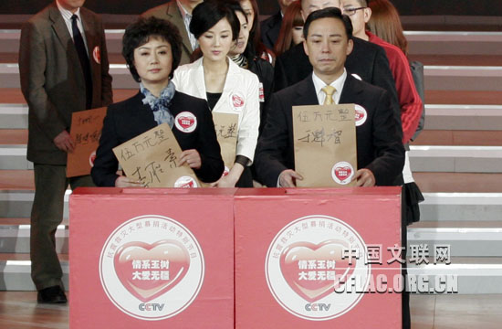 4月20日晚,由中宣部、民政部、国家广电总局、中国红十字会总会、中华慈善总会联合主办的“情系玉树 大爱无疆”抗震救灾大型募捐活动在北京隆重举行。募捐活动结束时,现场共募集到各类款项21.75亿元人民币。图为印青(右)等艺术家现场捐款。中国文联网 邱振刚 摄