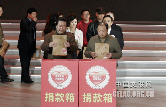 4月20日晚,由中宣部、民政部、国家广电总局、中国红十字会总会、中华慈善总会联合主办的“情系玉树 大爱无疆”抗震救灾大型募捐活动在北京隆重举行。募捐活动结束时,现场共募集到各类款项21.75亿元人民币。图为于魁智、李胜素等艺术家现场捐款。中国文联网 邱振刚 摄