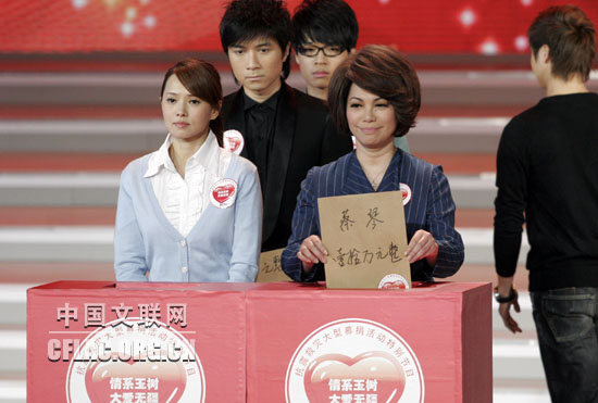 4月20日晚,由中宣部、民政部、国家广电总局、中国红十字会总会、中华慈善总会联合主办的“情系玉树 大爱无疆”抗震救灾大型募捐活动在北京隆重举行。募捐活动结束时,现场共募集到各类款项21.75亿元人民币。图为伊能静(左)、蔡琴(右)等台湾演艺界人士现场捐款。中国文联网 邱振刚 摄