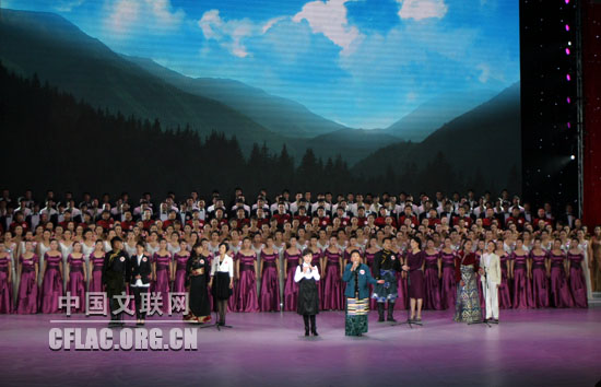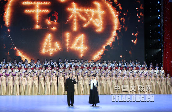 4月20日晚,由中宣部、民政部、国家广电总局、中国红十字会总会、中华慈善总会联合主办的“情系玉树 大爱无疆”抗震救灾大型募捐活动在北京隆重举行。图为才旦卓玛、李谷一等艺术家演唱《一个妈妈的女儿》。中国文联网 余宁 摄