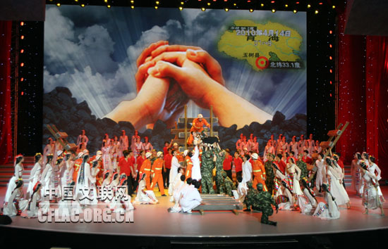 4月20日晚,由中宣部、民政部、国家广电总局、中国红十字会总会、中华慈善总会联合主办的“情系玉树 大爱无疆”抗震救灾大型募捐活动在北京隆重举行。募捐活动结束时,现场共募集到各类款项21.75亿元人民币。图为舞蹈《心手相连》。中国文联网 余宁 摄