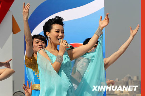 3月12日,歌手谭晶在演唱2010年上海世博会志愿者主题歌曲《世界》。新华社记者 任珑摄