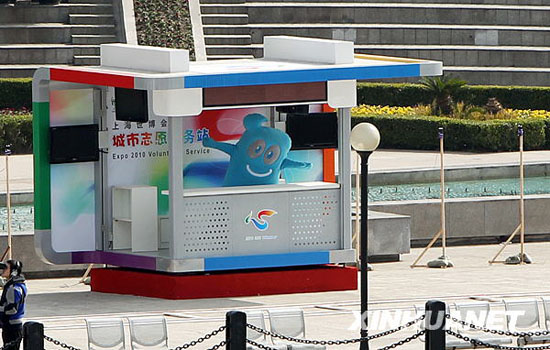 设立在上海黄埔江东岸滨江观光带的世博会城市志愿者服务站(3月12日摄)。新华社记者 任珑摄