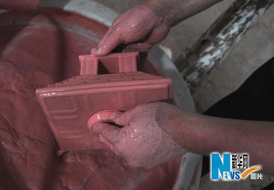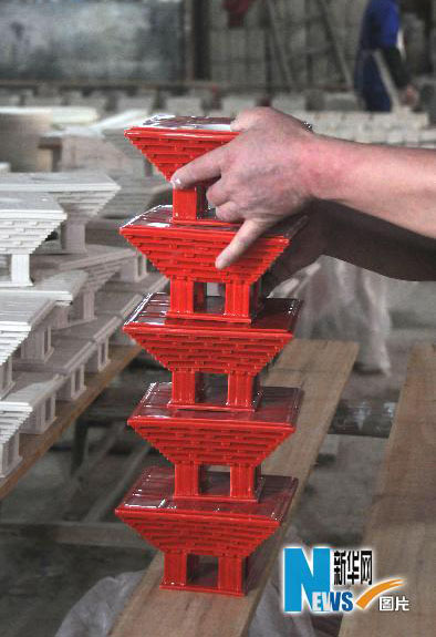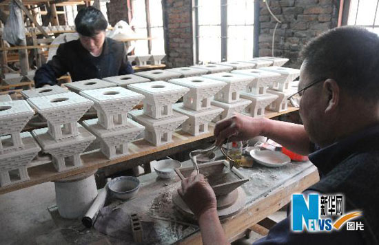 4月27日,在景德镇艺术瓷厂,民间艺人张茂生在对陶瓷“中国馆”进行削坯。今年58岁的张茂生是江西省景德镇市民间陶瓷艺人,2010年3月他设计的“中国馆”陶瓷工艺品被2010年上海世博会组委会选定为特许礼品。这批陶瓷“中国馆”高13厘米,长18厘米,宽15厘米,在设计中采用了一个密闭内胆的设计,限量发行,每件作品都打上了标号,一共生产2010个。为了赶到5月份如期完工,张茂生目前在加班加点工作,从制坯、削坯、粘坯、晾坯、上釉到烧成,整个流程一丝不苟。新华社发(石卫明 摄)