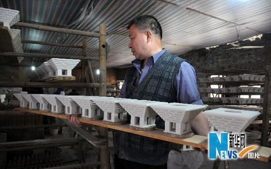 4月27日,在景德镇艺术瓷厂,民间艺人张茂生在检查烧成的陶瓷“中国馆”。新华社发(石卫明 摄)