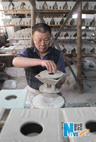 4月27日,在景德镇艺术瓷厂,民间艺人张茂生在修整陶瓷“中国馆”坯体。新华社发(石卫明 摄)