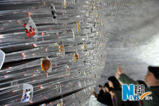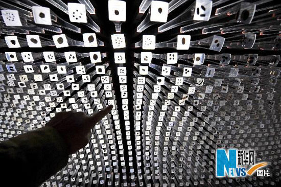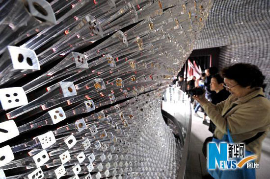 英国馆里安放着植物种子的透明亚克力杆(4月26日摄)。英国馆是“种子圣殿”,在其方形建筑外表上,遍布6万多根由透明材料亚克力制作的长杆,而每根长杆中都有一颗或数颗种子。它又是“蒲公英”,风吹杆动的整体感觉如飘舞的蒲公英。新华社记者 王定昶 摄