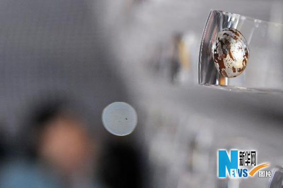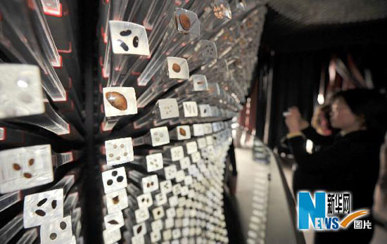 被安放在英国馆的一根亚克力杆里的种子(4月26日摄)。英国馆是“种子圣殿”,在其方形建筑外表上,遍布6万多根由透明材料亚克力制作的长杆,而每根长杆中都有一颗或数颗种子。它又是“蒲公英”,风吹杆动的整体感觉如飘舞的蒲公英。新华社记者 王定昶 摄