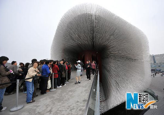 4月26日,大批游客在排队准备进入英国馆参观。英国馆是“种子圣殿”,在其方形建筑外表上,遍布6万多根由透明材料亚克力制作的长杆,而每根长杆中都有一颗或数颗种子。它又是“蒲公英”,风吹杆动的整体感觉如飘舞的蒲公英。新华社记者 王定昶 摄