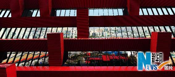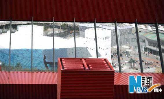 5月2日,世博会阿曼馆倒映在中国馆的外墙上。新华社记者 章磊 摄