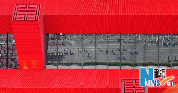5月2日,上海市的景色倒映在中国馆的外墙上。新华社记者 徐家军 摄