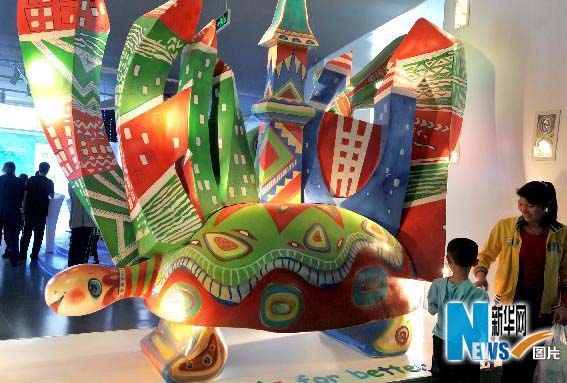 5月2日,俄罗斯馆内一个乌龟背上的“未来城市”雕塑引起了孩子的兴趣。新华社记者 王定昶 摄