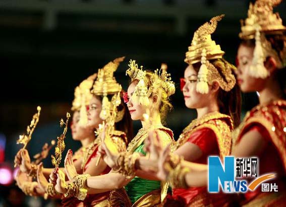 当晚,上海世博园亚洲广场上演柬埔寨歌舞,来自柬埔寨的演员用曼妙舞姿向参观者展现丰富多彩的民族风情和古老文化。 新华社记者 王迎 摄