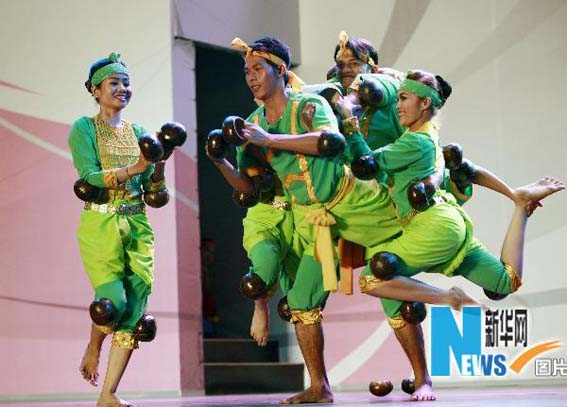 5月2日,柬埔寨演员在表演展现农民劳作后欢乐情绪的竹竿舞。