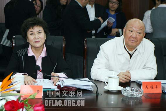 5月5日,中国文联第八届主席团第六次会议在北京举行。图为刘兰芳(左)和吴雁泽在会上。中国文联网 余宁 摄