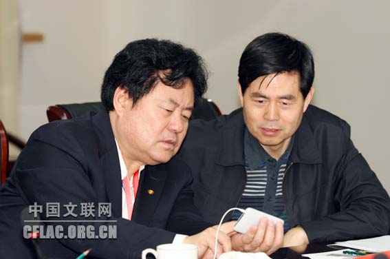 5月5日,中国文联第八届主席团第六次会议在北京举行。图为徐沛东(左)和季国平在会上相互交流。中国文联网 余宁 摄