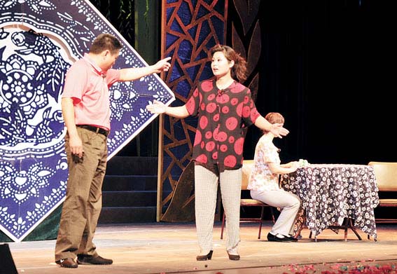 作为首届中国农民艺术节配套活动之一的全国“三农”题材小戏小品精品展演活动,6月4日晚在昆山淀山湖镇精彩亮相。中国文联国内联络部副主任周雪静,江苏省文联党组副书记、副主席杨企鹏,江苏省戏剧家协会驻会副主席、秘书长杨丽娟,苏州市文联主席朱建华,中共昆山市委常委、宣传部部长杭颖,淀山湖镇人民政府镇长韩晓燕等出席活动并分别致辞。图为吕剧《好事多磨》剧照。