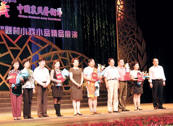 作为首届中国农民艺术节配套活动之一的全国“三农”题材小戏小品精品展演活动,6月4日晚在昆山淀山湖镇精彩亮相。中国文联国内联络部副主任周雪静,江苏省文联党组副书记、副主席杨企鹏,江苏省戏剧家协会驻会副主席、秘书长杨丽娟,苏州市文联主席朱建华,中共昆山市委常委、宣传部部长杭颖,淀山湖镇人民政府镇长韩晓燕等出席活动并分别致辞。图为领导上台为5个戏曲团队颁奖。