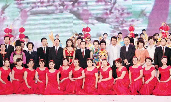 6月3日,首届中国农民艺术节开幕式文艺晚会在江苏昆山成功举行。图为全国政协副主席、中国文联主席孙家正,中国文联党组副书记、副主席覃志刚,文化部副部长杨志今,中国文联党组成员、书记处书记夏潮,农业部总经济师张玉香等领导与演出人员合影。