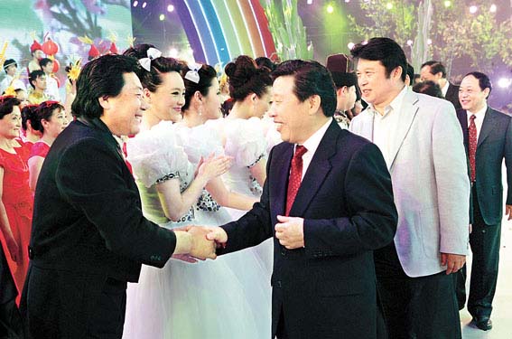 6月3日,首届中国农民艺术节开幕式文艺晚会在江苏昆山成功举行。图为全国政协副主席、中国文联主席孙家正以及中国文联党组副书记、副主席覃志刚,党组成员、书记处书记夏潮等领导观看在江苏昆山举办的“希望的田野”首届中国农民艺术节开幕式文艺晚会后接见艺术家代表。