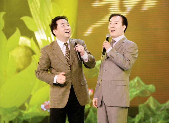 6月3日,首届中国农民艺术节开幕式文艺晚会在江苏昆山成功举行。图为姜昆、戴志诚表演相声《合家欢》。