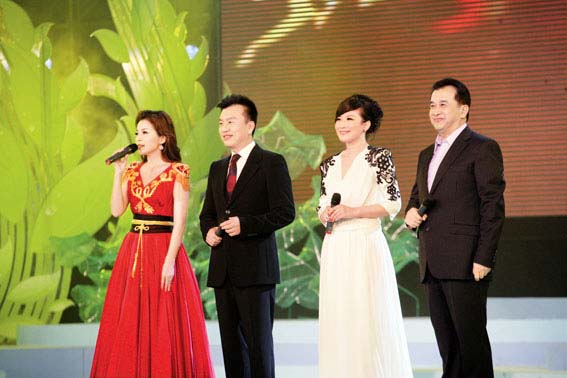 6月3日,首届中国农民艺术节开幕式文艺晚会在江苏昆山成功举行。图为黄宏、张泽群、朱迅等主持文艺晚会。