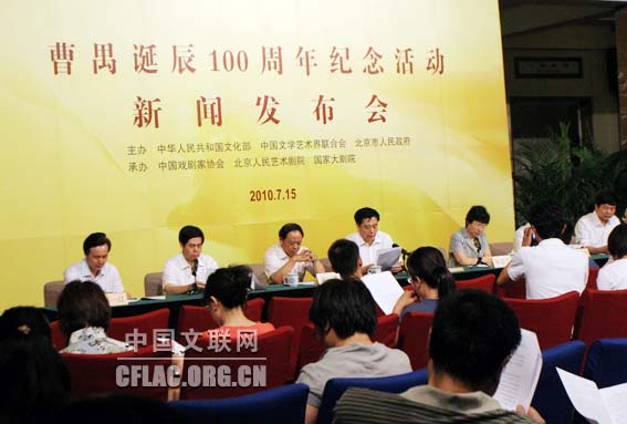 今年9月24日,是中国现代话剧的奠基人、著名剧作家曹禺先生诞辰100周年纪念日。为缅怀曹禺为中国戏剧事业所做出的杰出贡献,纪念曹禺诞辰100周年系列纪念活动将在今年9月举办。7月15日,由文化部、中国文联、北京市政府主办,中国剧协、北京人艺、国家大剧院承办的曹禺诞辰100周年系列纪念活动新闻发布会在首都剧场举行。中国文联党组成员、书记处书记夏潮,中国剧协分党组书记、驻会副主席季国平,文化部艺术司司长董伟,北京市政府副秘书长侯玉兰,北京市委宣传部副部长张淼,国家大剧院副院长邓一江,北京人艺副院长崔宁出席新闻发布会。