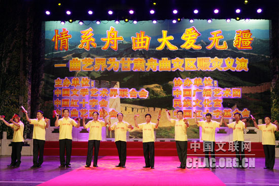 8月16日晚,由中国文联、中国红十字会、中国曲协主办,中国广播艺术团、民族文化宫、中国红十字基金会协办的“情系舟曲 大爱无疆——曲艺界为甘肃舟曲灾区赈灾义演”在北京民族宫大剧院举行。图为群口快板《风雨同舟连心曲》。中国文联网 孟祥宁 摄