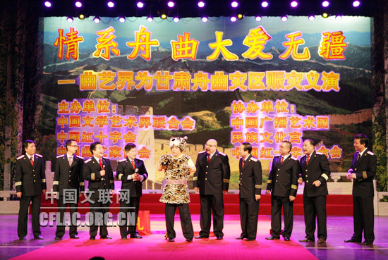 8月16日晚,由中国文联、中国红十字会、中国曲协主办,中国广播艺术团、民族文化宫、中国红十字基金会协办的“情系舟曲 大爱无疆——曲艺界为甘肃舟曲灾区赈灾义演”在北京民族宫大剧院举行。图为群口相声《慰问》。中国文联网 孟祥宁 摄