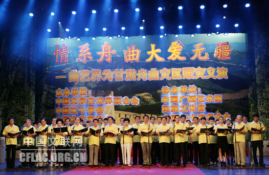 8月16日晚,由中国文联、中国红十字会、中国曲协主办,中国广播艺术团、民族文化宫、中国红十字基金会协办的“情系舟曲 大爱无疆——曲艺界为甘肃舟曲灾区赈灾义演”在北京民族宫大剧院举行。图为诗朗诵《我们和舟曲在一起》。中国文联网 孟祥宁 摄