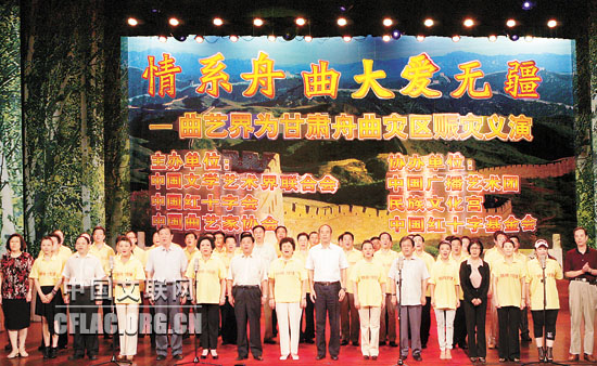 8月16日晚,由中国文联、中国红十字会、中国曲协主办,中国广播艺术团、民族文化宫、中国红十字基金会协办的“情系舟曲 大爱无疆——曲艺界为甘肃舟曲灾区赈灾义演”在北京民族宫大剧院举行。图为全体演员高唱《歌唱祖国》。中国文联网 孟祥宁 摄