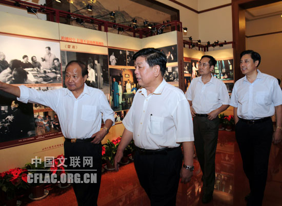 北京人艺新版《日出》历时两个多月打磨后,于9月7日晚正式亮相首都剧场,为曹禺诞辰一百周年纪念演出拉开序幕。演出当晚,曹禺诞辰一百周年纪念演出启动仪式、曹禺诞辰一百周年纪念展和北京人艺艺术家书画作品展开幕式,同时在首都剧场大厅举行。中国文联党组书记、副主席胡振民,文化部艺术司司长董伟,北京市委宣传部常务副部长陈启刚,北京人艺院长张和平,国家大剧院副院长邓一江,曹禺的女儿万方、万昭,以及著名表演艺术家蓝天野、朱旭等出席仪式。图为胡振民等观看展览。高扬 摄