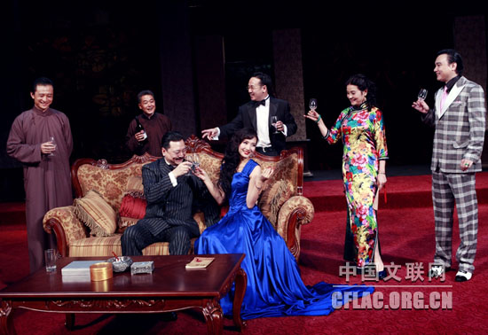 北京人艺新版《日出》历时两个多月打磨后,于9月7日晚正式亮相首都剧场,为曹禺诞辰一百周年纪念演出拉开序幕。图为《日出》剧照。