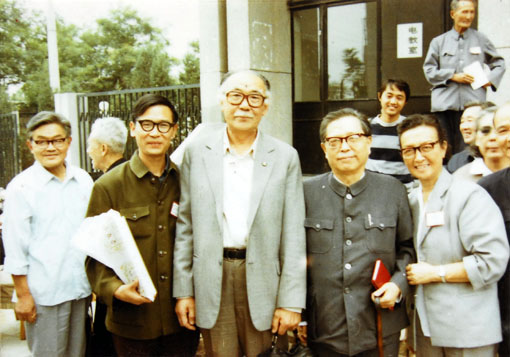 1985年,国立剧专在中央戏剧学院举行五十周年校庆,曹禺(右二)与凌子风(左三)等出席庆祝活动。